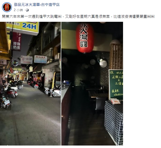台中最熱鬧的逢甲商圈今晚傳出變壓器故障,造成大規模無預警停電,從晚間8點半停到10點多,影響範圍包括逢甲大學與便當街,許多業者相當不滿,痛罵人潮終於回來一些竟然又沒電,損失慘重!大批網友在PTT上留言痛批太誇張,更有網友狂酸,這次換哪隻小動物出來自首?