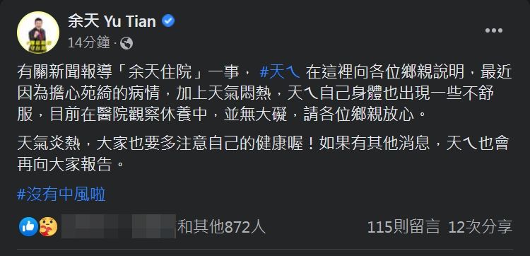 余天上午在臉書撰文指出,天氣炎熱,大家也要多注意自己的健康喔,如果有其他消息,他也會再向大家報告。