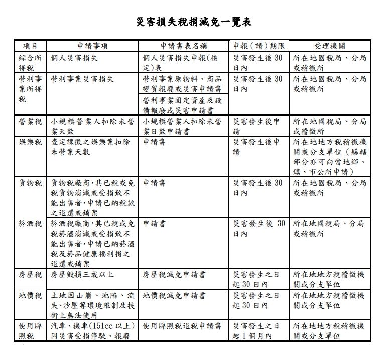 財政部指出,納稅義務人如對於災害損失稅捐減免之規定或申報(請)方式有不明瞭的地方,可就近向所在地稅捐稽徵機關查詢或於上班時間撥打免費服務專線0800-000-321,將有專人解說。