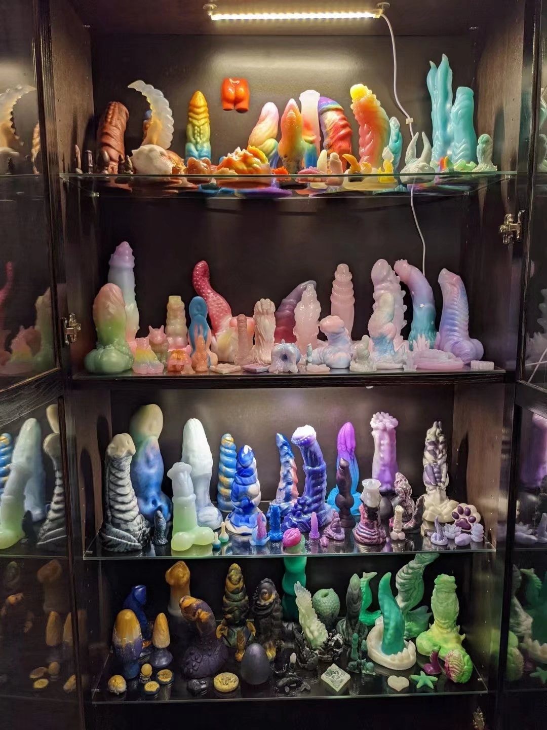 只見照片中,是滿滿一櫃的情趣用品,不管是大的、小的、尖的、圓的、有棱有角的……一應俱全。而且這些情趣用品還按顏色分別置放在四層櫃子裡,顏色搭配看起來相當療愈。