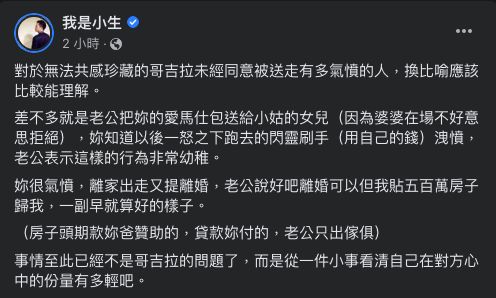 還原整起事件,15日一名人妻在臉書《匿名公社》PO文表示,因為親戚小孩來家裡作客時,很喜歡老公的哥吉拉模型公仔,便決定送出去後再買1隻一模一樣的回來,結果出差回來的老公得知後相當氣憤,「他開始整個暴怒不可理喻!一開始說那個很難買,後來又說就是要他自己買的那隻,像個小朋友一樣在鬧,然後就甩門出去了。」更向大眾抱怨「為了一個模型那麼幼稚,我該怎麼讓他別像個小男孩一樣呀!」。