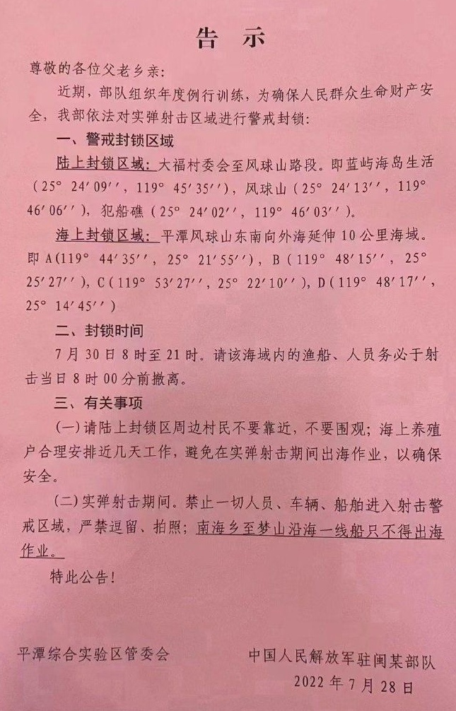 具體警戒封鎖區域為:A:25°25′27″N/119°48′15″E,B:25°21′55″N/119°44′35″E,C:25°14′45″N/119°48′17″E,D:25°22′10″N/119°53′27″E等四點連線範圍內水域。