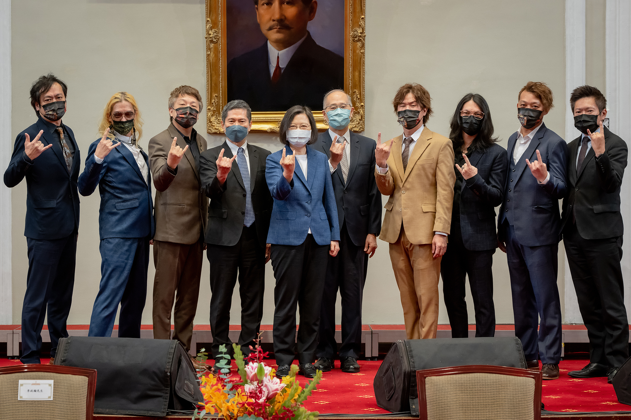 總統蔡英文今(15)日在總統府接見《八歌浪Pakelang》專輯團隊,恭喜他們為台灣拿下首座葛萊美獎,讓台灣的軟實力在國際發揚光大。這張專輯的設計師李政瀚和于薇,在今年葛萊美獎的「最佳唱片包裝獎」奪下獎座,連總統蔡英文都大讚「真的非常不簡單」。沒想到在合照的階段,眾人調皮模仿起動漫《JoJo的奇妙冒險》中被稱為「JoJo立」的誇張動作,引起站在中間的蔡英文與文化部長李永得一臉尷尬。