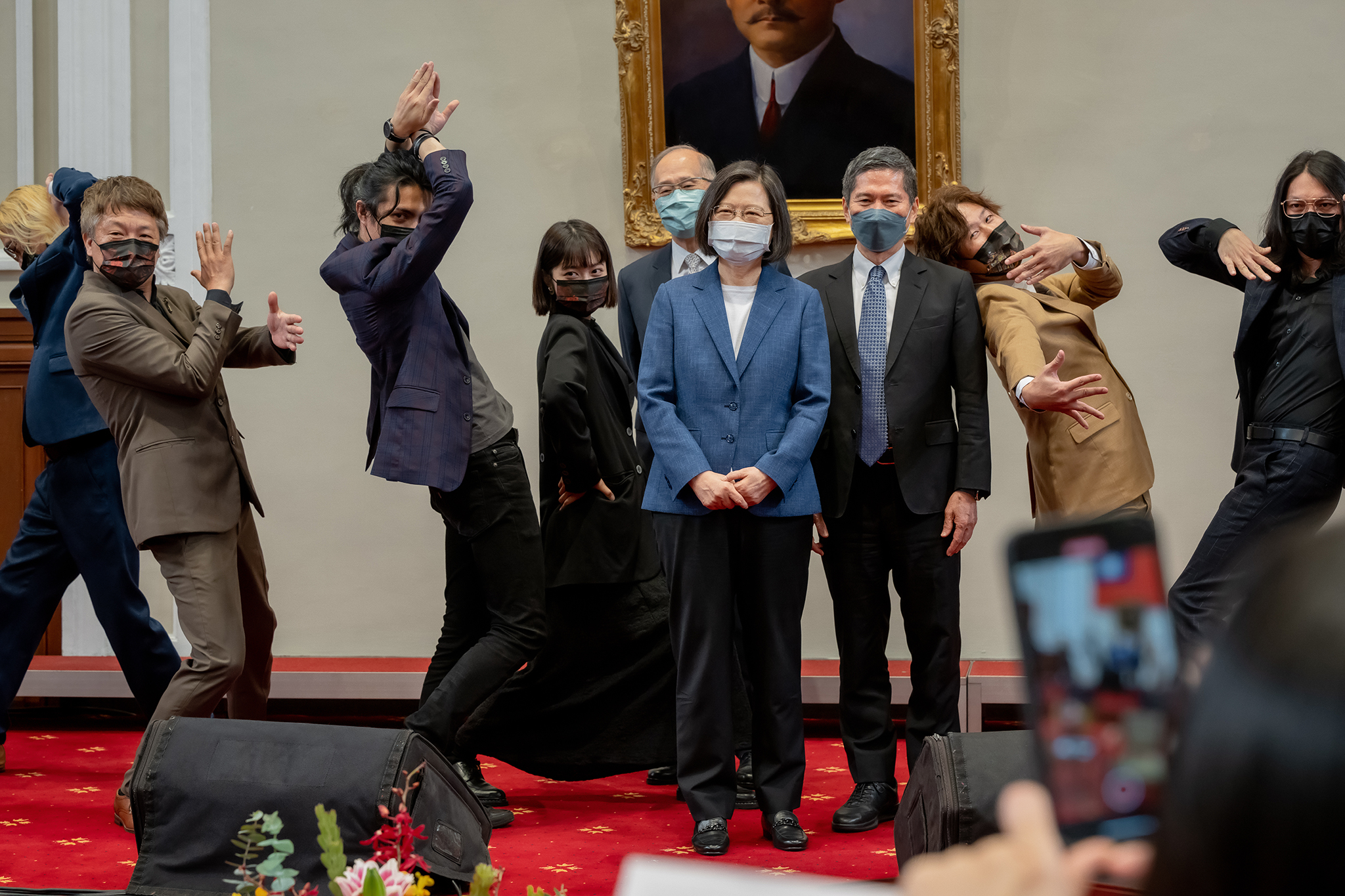 蔡英文在個人IG發出多張今日接見《八歌浪Pakelang》專輯團隊的合照,照片中大家大動作的比出「JoJo立」動作,卻只有蔡英文與李永得兩人直挺挺的站在正中央,畫面充滿著巧妙違和感。其中一張照片蔡英文面露尷尬歪頭看向身後的大家,更引發網友熱議。