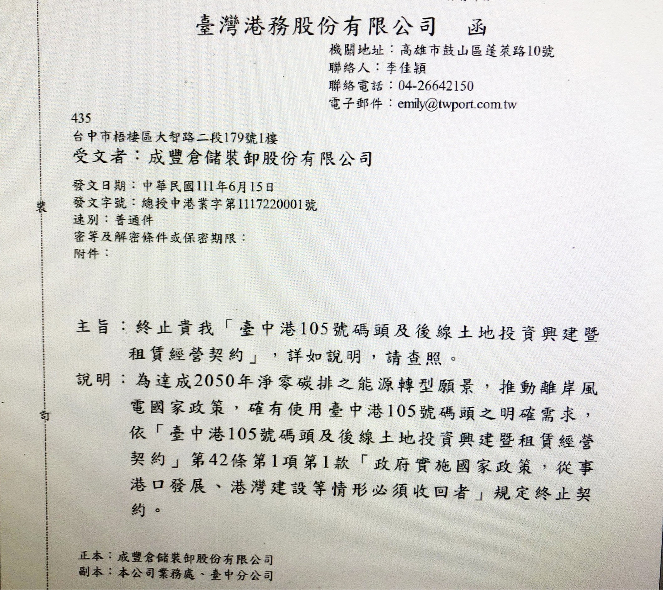 不過在111年6月15日,台灣港務公司發出了公文,以要推動離岸風電國家政策,有使用台中港105號碼頭的明確需求,正式收回碼頭,終止雙方契約,這也等於斷了成豐倉儲公司,總營收估計破百億的事業,不過成豐倉儲和顏家,都還沒正式做出回應,只有私下表示要提告求償違約金,然而台灣港務公司搬出了法令,台中港務分公司業務處經理李佳穎說:「配合政府政策來收回租賃標的的話,港務公司要在6個月前通知業者,那承租業者是不得要求任何的補償。」台中港105號碼頭的經營權,目前碼頭將被收回,未曾停歇的紛擾,恐怕還會持續延燒。