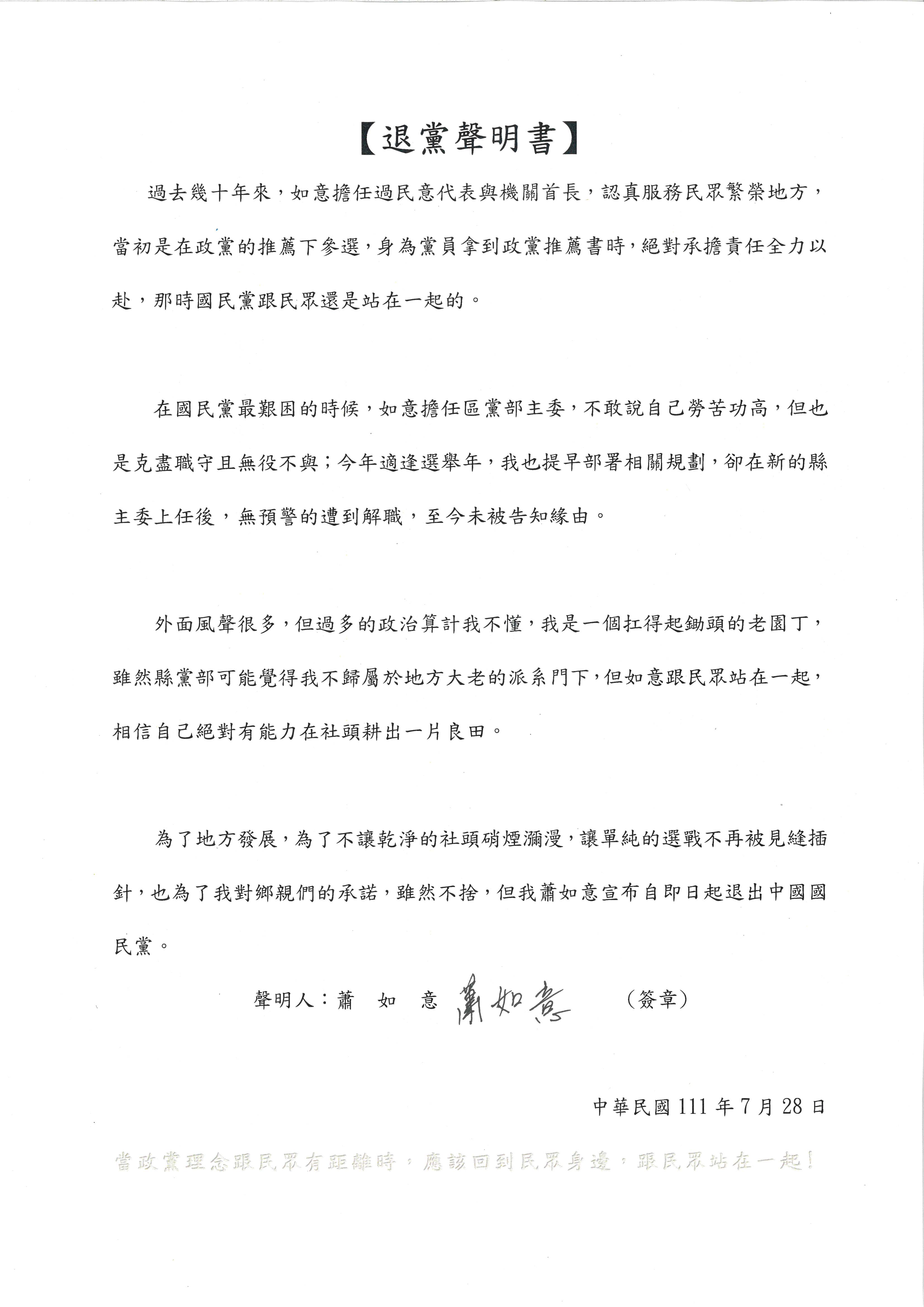 蕭如意說,為了地方發展,為了讓單純選戰不再被見縫插針,也為了對鄉親們的承諾,他雖然不捨,但還是決定退出國民黨。