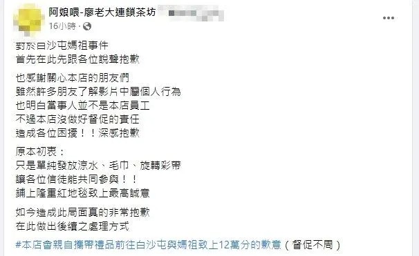 阿娘喂台東加盟店事後也在臉書發文道歉,表示沒做好督促的責任,造成各位困擾「原本初衷,只是單純發放涼水、毛巾、旋轉彩帶,讓各位信徒能共同參與!鋪上隆重紅地毯致上最高誠意,如今造成此局面真的非常抱歉,在此做出後續之處理方式,本店會親自攜帶禮品前往白沙屯與媽祖致上12萬分的歉意」。