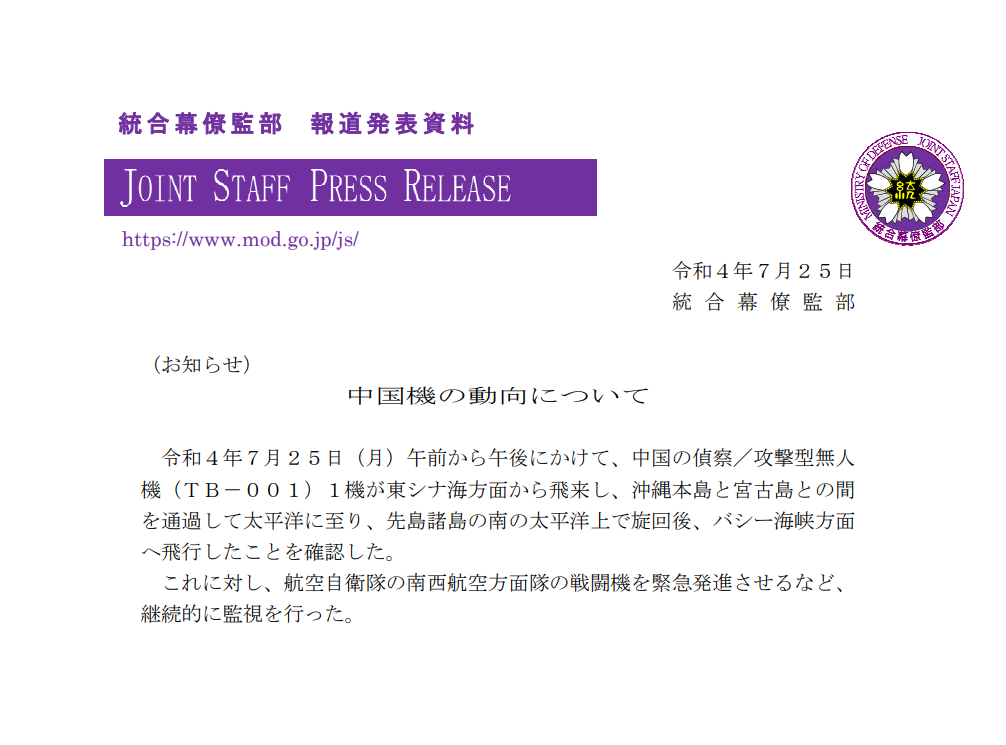 軍機擾台!中國無人機今現蹤台灣東部空域 2022-07-25|即時新聞/綜合報導|大全民前衛新聞 分享 中國解放軍今天(25日)不僅派遣殲-11等2架次戰機擾台,根據國防部及日本防衛省資訊指出,解放軍今還派一架次「TB-001」無人機,現蹤我國東部外海空域,國軍及日本自衛隊皆持續監控動態。 根據日本防衛省統合幕僚監部今晚最新報告顯示,解放軍派遣1架次攻擊、偵查兩用型無人機「TB-001」不但通過宮古海峽、日本沖繩群島以南空域,還在我國花蓮以東外圍空域來回飛行,日本航空自衛隊南西航空方面隊甚至緊急派戰機起飛監控。 上一則 下一則 五月天 [ 好好好想見到你 ] Mayday fly to 2021 跨年演唱會 向來寵粉的台灣天團五月天,日前,無預警宣佈要舉辦《好好好想見到你》網路線上特別版演唱會,陪伴全球的五迷迎接2021新年。主唱大人阿信在社群平台寫下:「誰說這巨大的體育場中空無一人?讓五月天再揮霍一回任性填滿你心。從踟躕前行的2020,唱到煙花盛開的2021!」現在就帶大家直擊五月天的《好好好想見到你》線上演唱會! ADS 查看更多 人氣新聞 日本國會大選:首相高市早苗壓倒性勝出 彰化縣議員發揚書法「揮毫開筆」 命理師示警:不能貼這字 奇美博物館《埃及之王:法老》280件真跡鉅獻 黎智英遭重判20年 華爾街社論:示警台灣 近十年最大規模!台化千億元聯貸案完成簽約 王滬寧國共論壇下令統一?國民黨:均屬臆測 推薦閱讀 近十年最大規模!台化千億元聯貸案完成簽約 2026彰化縣長提名卡關 鄭麗文喊無人 彰化縣議員發揚書法「揮毫開筆」 命理師示警:不能貼這字 轉彎車打方向燈仍吃罰單 竟是停等紅燈時關掉 北車隨機砍人惡煞奪4命! 妨害兵役遭通緝 結束合作 台灣「家樂福」將改名