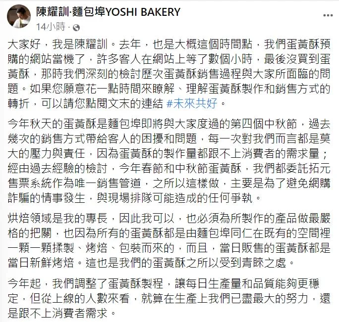 陳耀訓在官方粉專「陳耀訓·麵包埠YOSHI BAKERY」發文坦言,每次開賣對他們都是莫大的壓力與責任,因為蛋黃酥的製作量始終跟不上消費者的需求量,為了避免網購詐騙跟現場排隊可能造成的任何爭執,今年開始委託售票系統作為唯一銷售管道,只是從上線的人數來看,就算在生產上已盡最大的努力,還是負荷不了消費者的需求。
