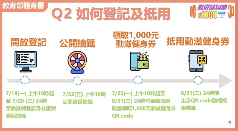 根據體育署統計,符合參與登記健身券的民眾約1200萬多人,至於民眾若不確定去年是否曾於振興五倍券平台完成勾選「動滋券」參與抽籤,也可上動滋網查詢確認。若登記人數超過30萬名,預計7月22日上午10時在體育署公開辦理電腦隨機抽籤,中籤民眾將收到簡訊及email通知,並在當天下午3時起,可上動滋網查詢中籤結果,並於7月25日上午10時起至8月31日24時止進行領券及抵用。