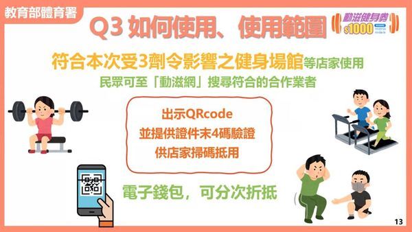 因本土疫情爆發,指揮中心4月時規定,到健身場館民眾,須完成COVID-19疫苗第3劑接種,當時掀起不少爭議,直到5月27日才放寬相關規定,體育署經考量後,決議加碼協助受三劑令影響之健身場館業者,因此推出30萬份的1000元「動滋健身券」,民眾可至「動滋網」搜尋符合的合作業者。
