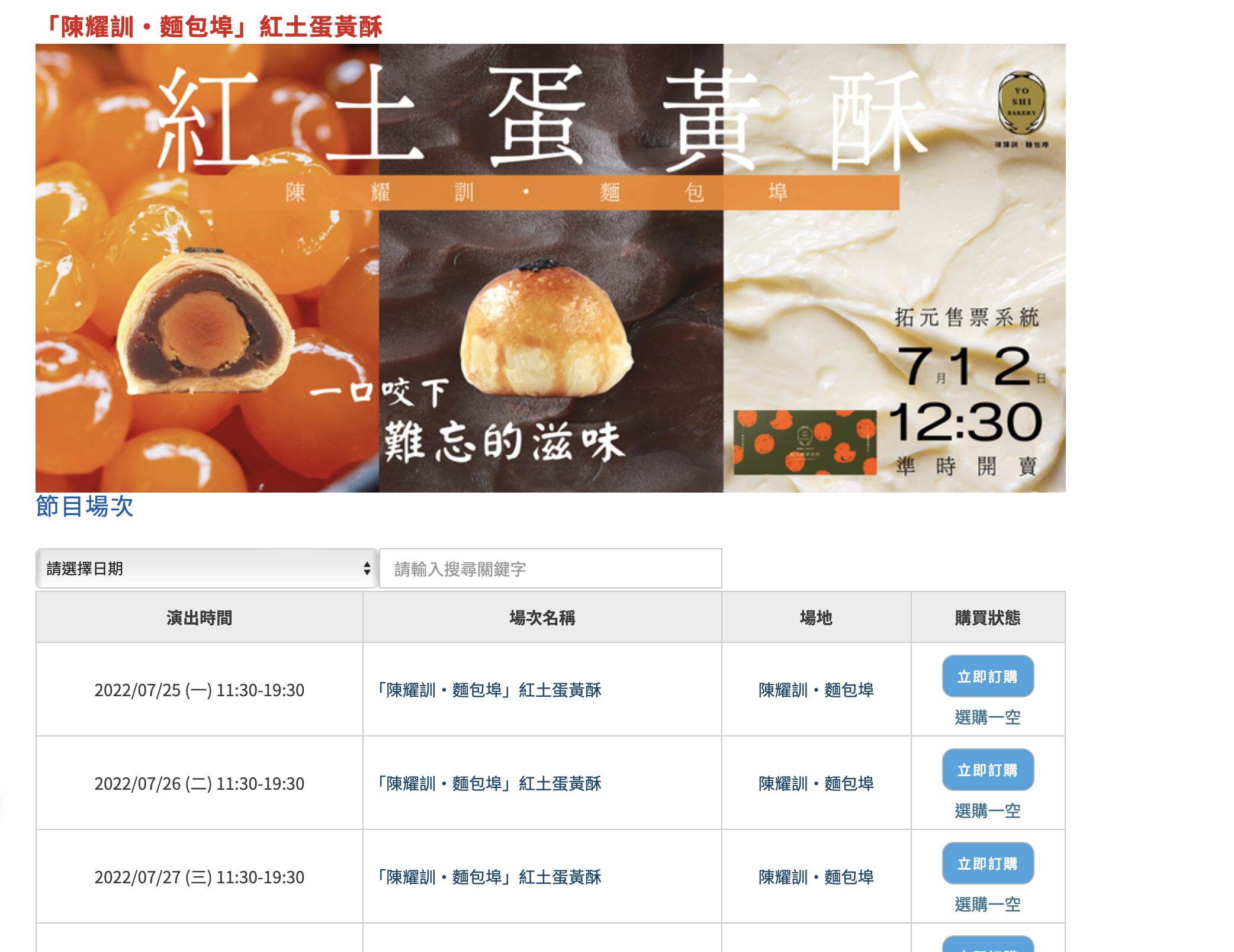 世界麵包冠軍陳耀訓所推出的「紅土鹹蛋黃酥」,號稱是「史上最難搶的蛋黃酥」。單價800元(10入)的陳耀訓紅土鹹蛋黃酥禮盒,今年第二度使用演唱會門票常使用的「拓元售票系統」,在7月12日中午12點30分開賣。雖有「每人限購5盒」規定,但在粉絲熱情搶購下,開賣1分鐘就秒殺,讓許多沒買到的網友哀嚎,更有網友發現在拍賣網站上已飆賣到2500元一盒。