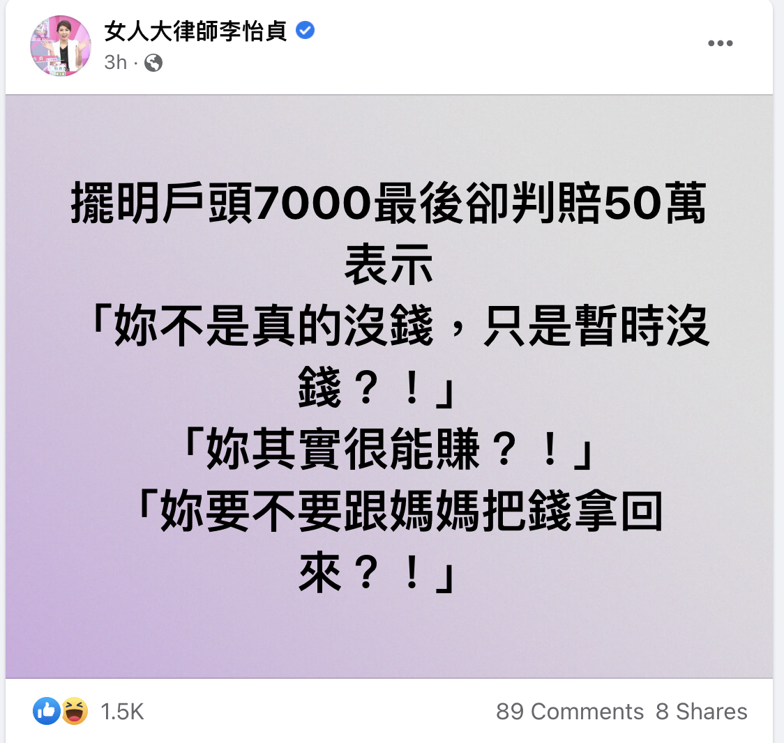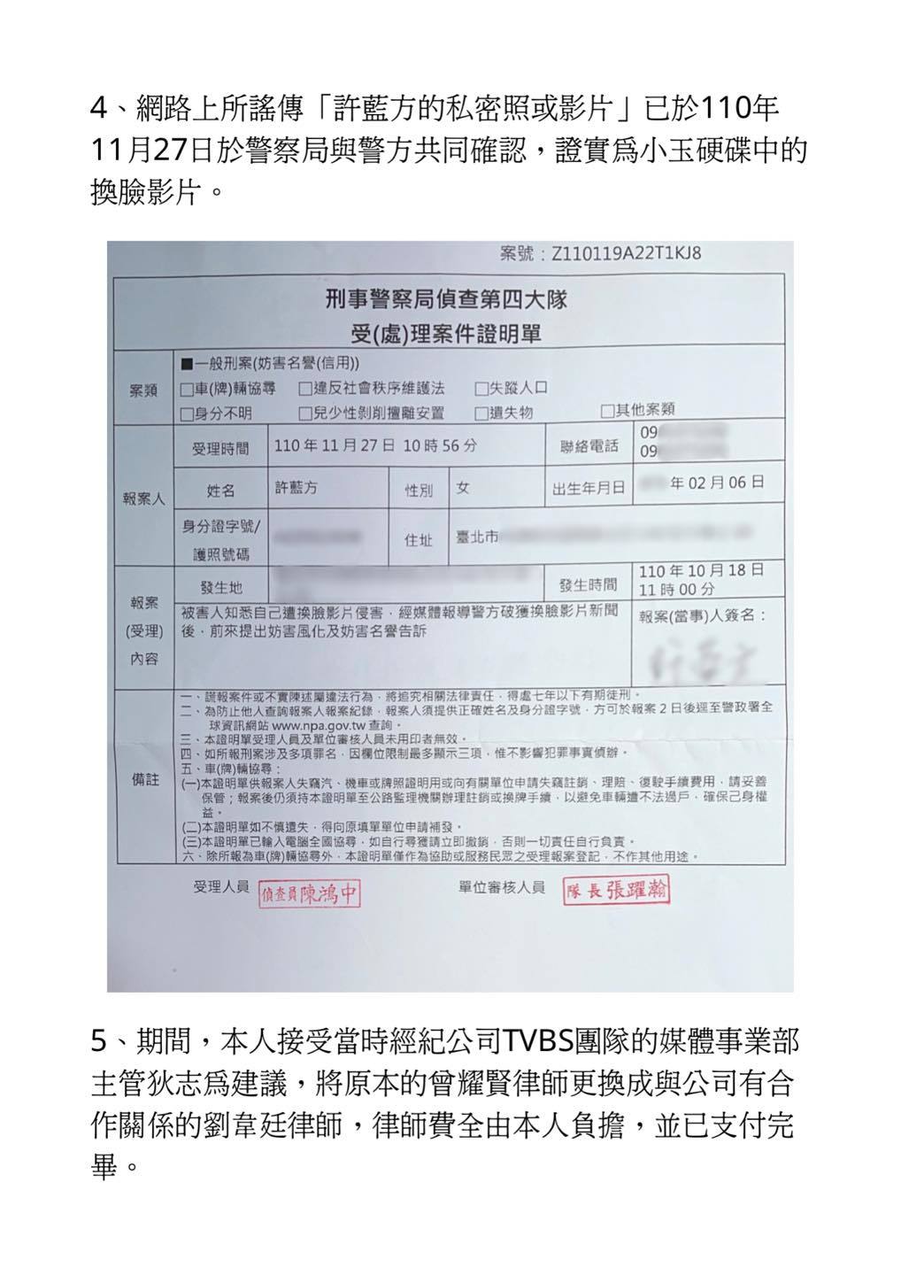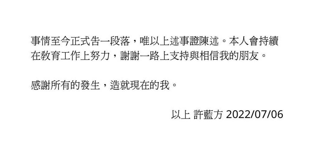 台北地院上月開庭,許藍方獨自出庭、答辯,身邊並無律師陪同,事後被媒體問及此事,無奈表示自己為了打官司花光積蓄,戶頭只剩下7000元,只好跟原本的律師解除委任,接著更語帶哽咽地說,這件事已經嚴重影響其生活、經濟和外界對她的看法。不過,台北地院仍認定許藍方侵害配偶權,今判賠50萬元;可上訴。