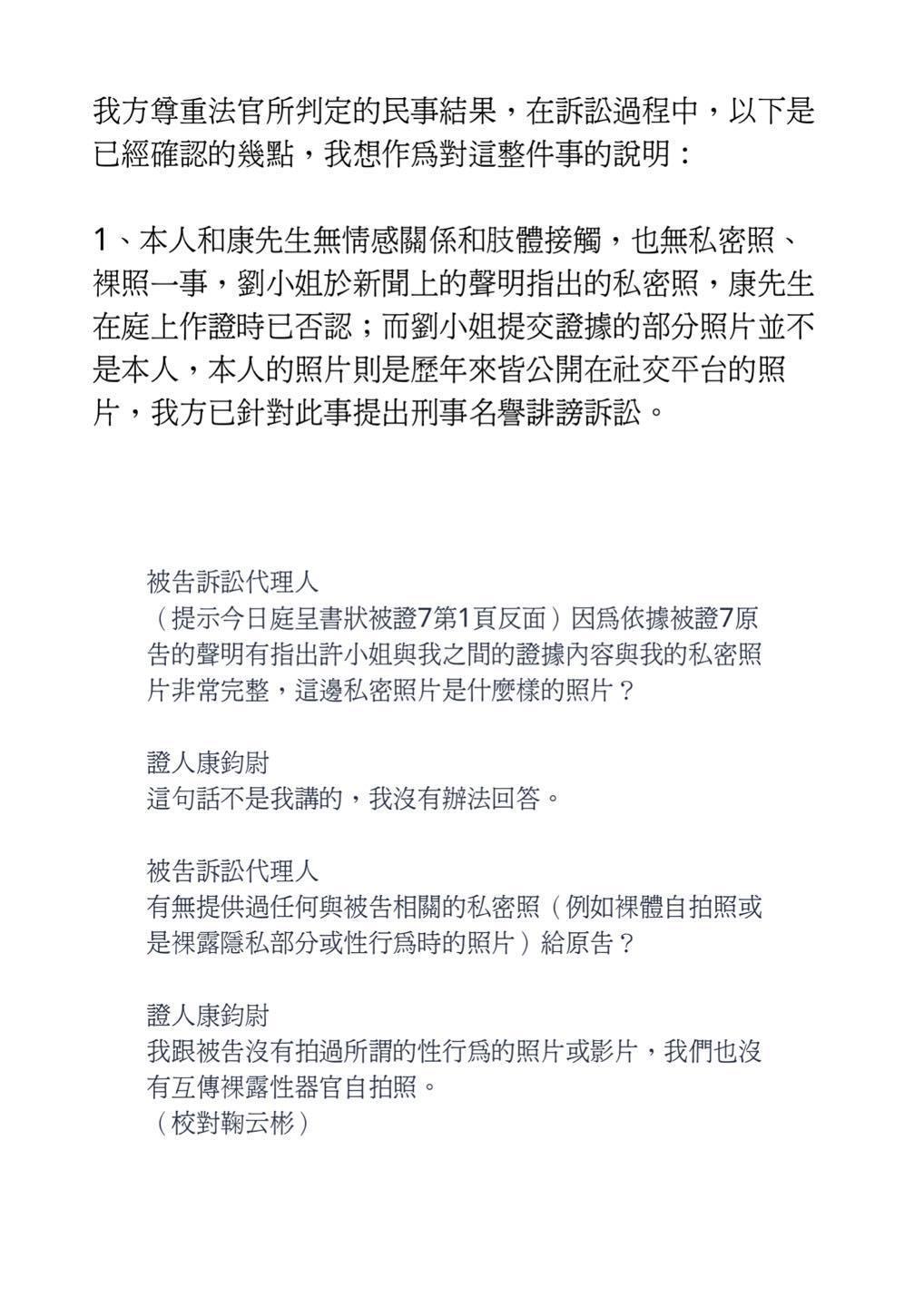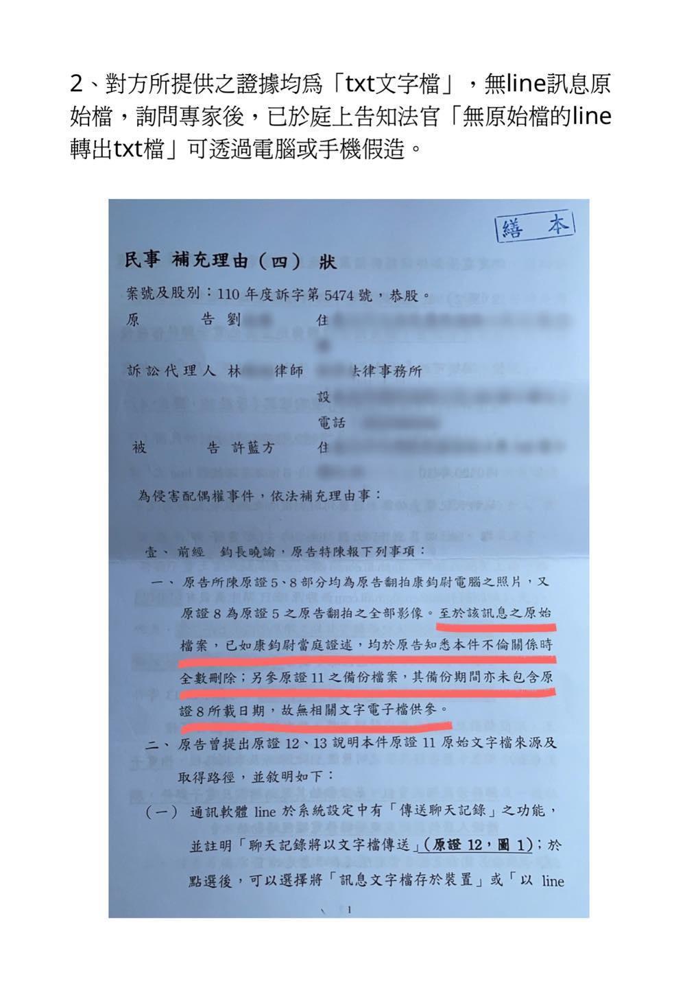 歷經多次開庭,法官希望兩方和解,但劉姓正宮要求許藍方必須公開道歉,並承認不倫,否則不會撤告。庭訊時,許藍方堅稱與康鈞尉無不正當男女交往關係,2人在通訊軟體上也是以「學長、學妹」互稱,反控是男方暈船;至於為何不封鎖對方?她則回應,「我刻意不封鎖他,是因為想看他又傳什麼東西給我」。