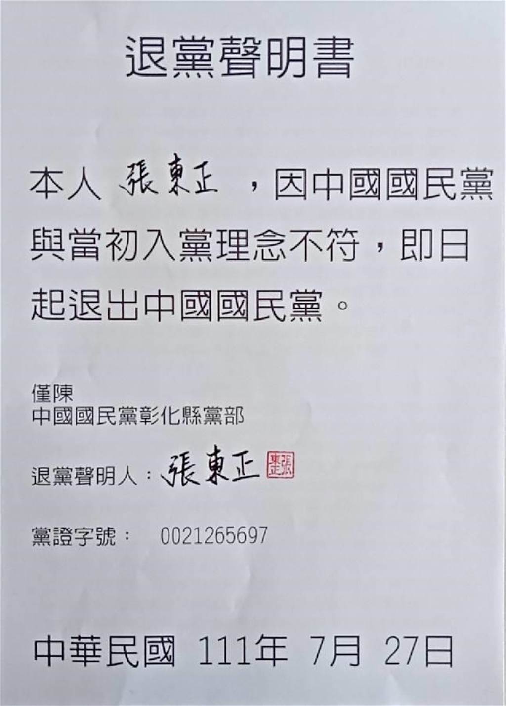 國民黨彰化市長初選落敗的前彰化縣議員張東正指出,初選落敗後,有人憑側面資訊,假設他未來的可能性,為了黨內和諧及斷絕不必要臆測,即刻退出國民黨。
