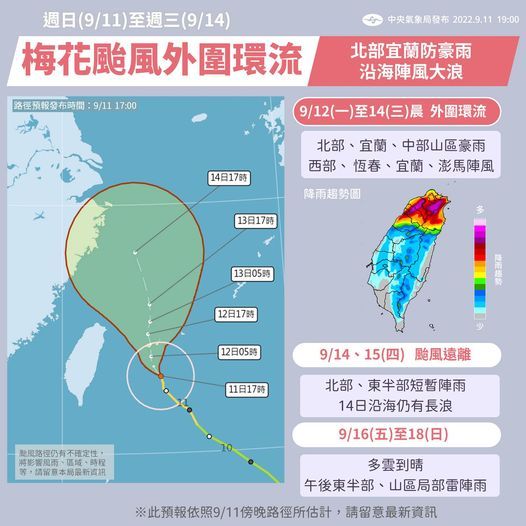 氣象局簡任技正伍婉華表示,預估梅花將以緩慢速度從東方海面慢慢北上,台灣受到颱風暴風圈影響,東半部海面風浪明顯增大,明天風力更強,東南部海面、東部海面已經有三到四米長浪,未來基隆北海岸、東半部、綠島、蘭嶼、恆春半島、馬祖會有長浪,情況持續到周三,海面及海邊活動要留意。