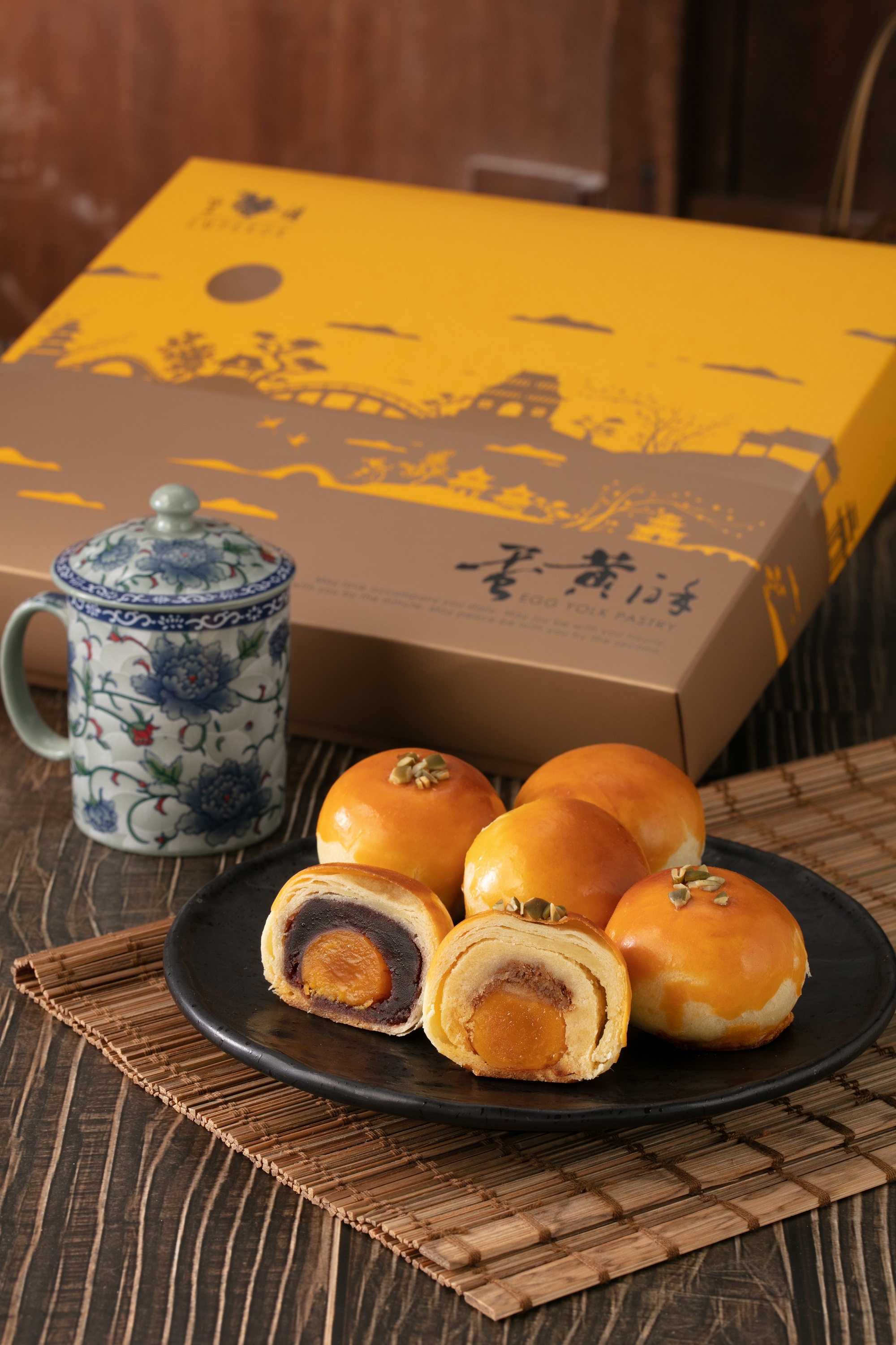 特製蛋黃酥以嚴選優質赤紅豆,煉製成口感濃郁的烏豆沙,並融合鹹香蛋黃,綿密的口感與香酥的金黃外皮有著堅持傳統的好滋味。
