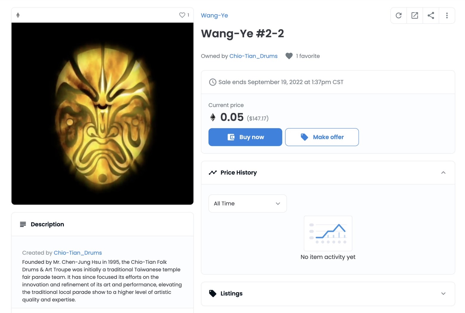 九天民俗技藝團總監許懷文表示富含寓意「王爺Wang-Ye」NFT,以九天的作品轉化成數位藝術,不僅僅體現實體藝術創作其數位藝術更極具收藏價值。並透過OpenSea的國際性平台,將台灣文化特殊的王爺信仰文化中的祝福介紹給全世界。