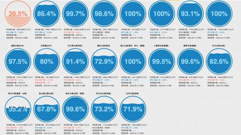 而寶山水庫、寶山第二水庫、鯉魚潭水庫、湖山水庫蓄水量更是來到100%,不過依據目前數據顯示,唯獨基隆新山水庫的水情仍亮紅燈,蓄水量僅有39.5%。
