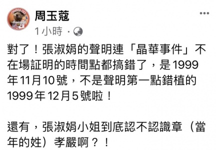然而周玉蔻剛再發文反嗆,痛批張淑娟的聲明連「晶華事件」不在場證明的時間點都搞錯了,「是1999年11月10號,不是聲明第一點錯植的1999年12月5號啦!」她更曬出一張手寫紙條埋下伏筆,質問「張淑娟小姐到底認不認識章(當年的姓)孝嚴啊?!」