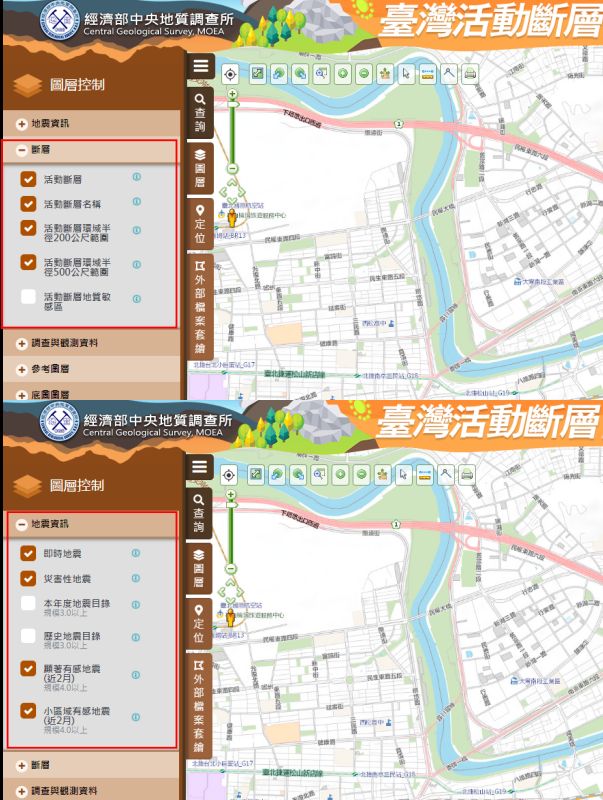 接著可以打開查詢系統中的「圖層」,將地震資訊里的「即時地震」、「災害性地震」、「顯著有感地震」及「小區域有感地震」選項全部勾選。勾選完畢後,再到「斷層」的選項中,將「活動斷層」、「活動斷層名稱」及「活動斷層環域半徑200公尺範圍」、「活動斷層環域半徑500公尺範圍」打開。